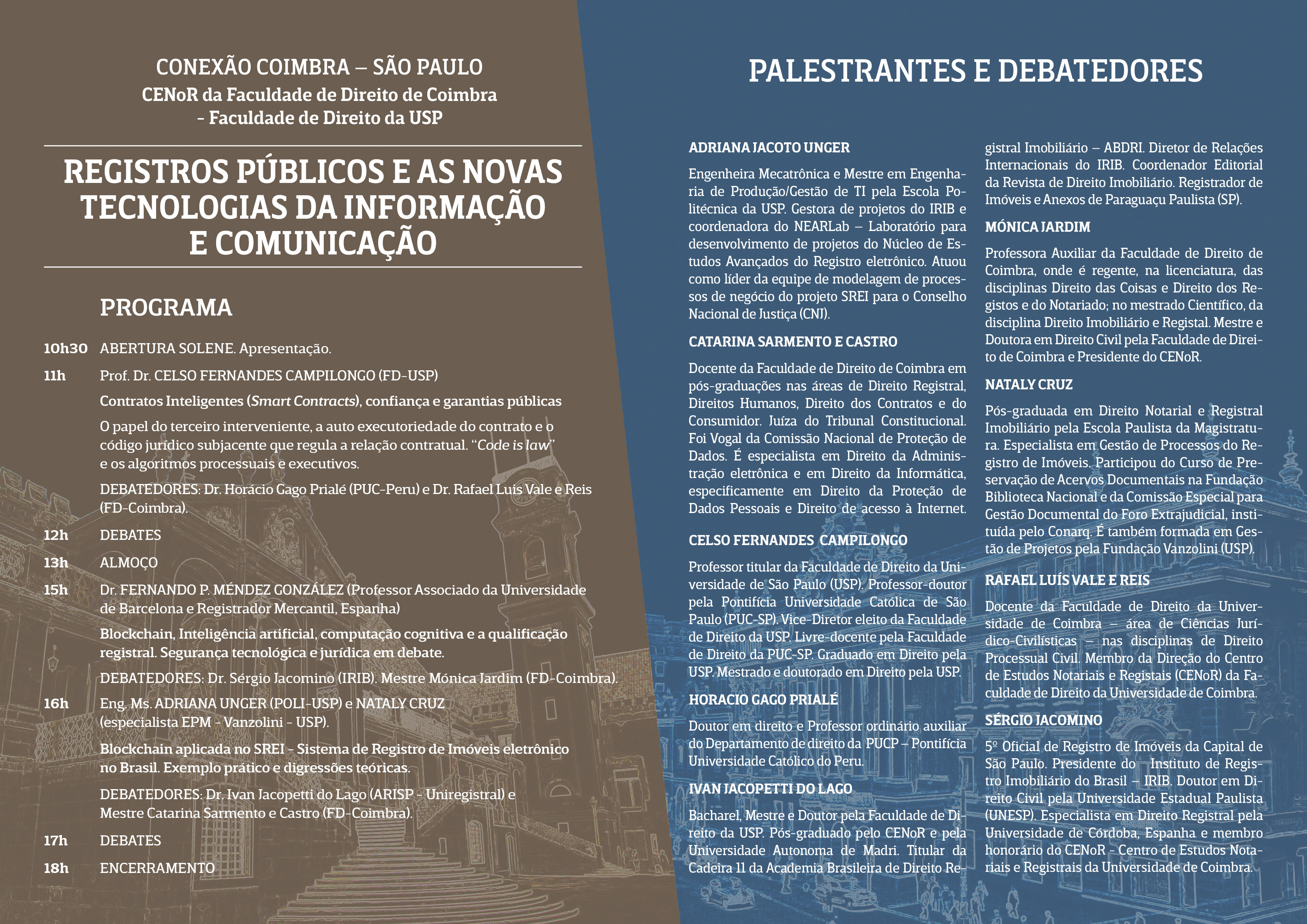 REGISTROS PÚBLICOS E AS NOVAS TECNOLOGIAS DA INFORMAÇÃO E COMUNICAÇÃO. Conexão Coimbra-SP. Evento realizado no dia 7/3/2019 na Faculdade de Direito da Universidade de Coimbra. → folder.